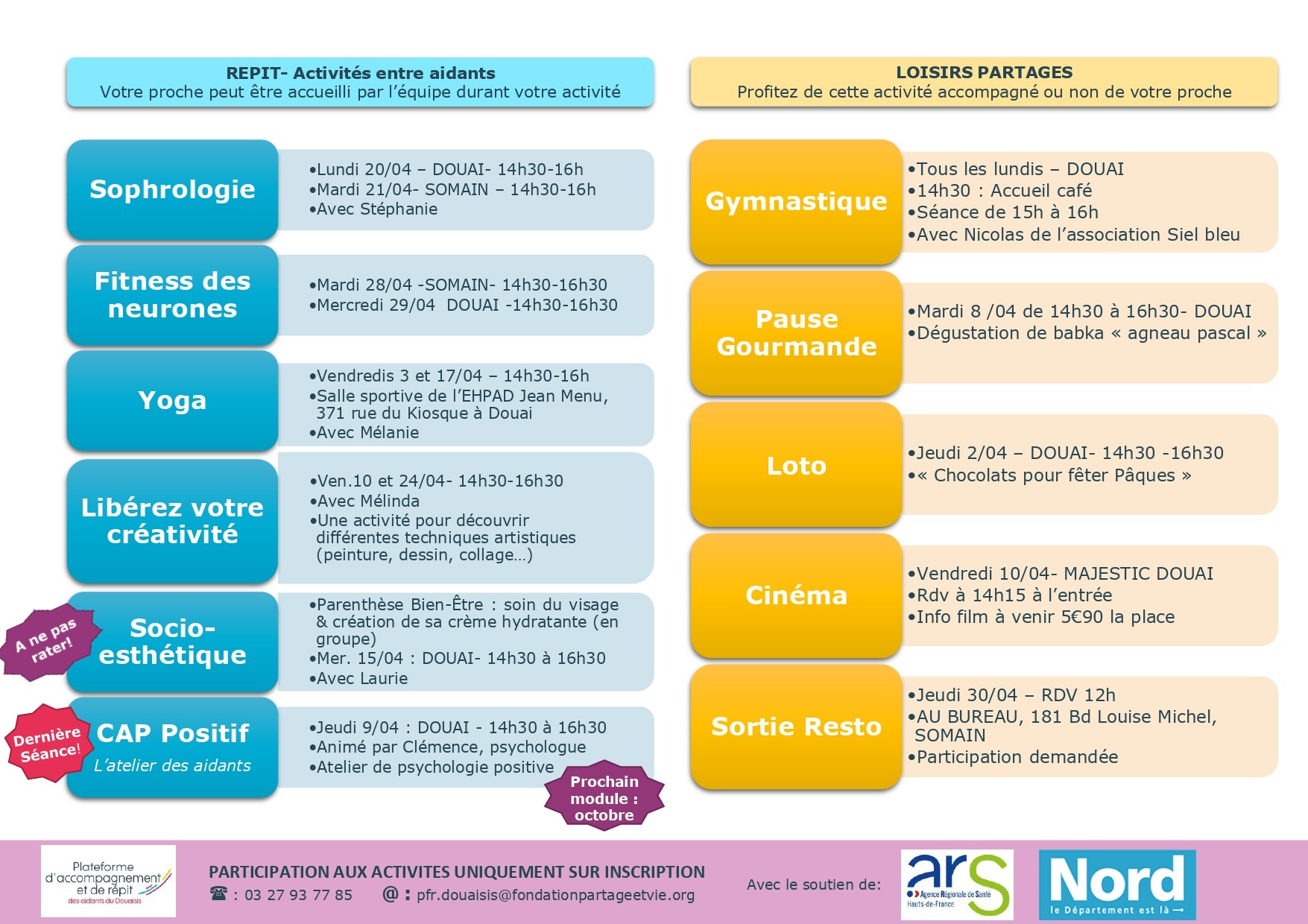 Nous restons toujours joignables aux numéros de téléphone habituels de chacun des sites. Des permanences ont lieu sur le territoire du DOUAISIS uniquement sur rendez vous. La prise de rendez-vous peut se faire en nous contactant directement par téléphone.